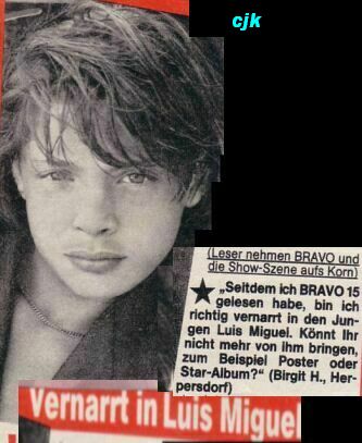 Fotos: Heeg. Slozower. BRAVO: ¿Es Luis Miguel tu nombre correcto? LUIS: Sí, mi nombre de pila. En el pasaporte dice Luis Miguel Gallego Basteri, nacido el 19 de abril de 1970 en Veracruz. BRAVO: ¿Entonces tu eres mexicano? LUIS: Mi hermano Alejandro (12) y yo nacimos en México, nuestro hermano más joven Sergio (1) en España, donde nosotros también tenemos una casa, en Madrid. Porque mi padre Luis es español y mi madre Marcela procede de Italia, de la Toscana. BRAVO: ¿Creciste con muchos idiomas? LUIS: Sí. Con mi padre hablo español, con mi madre italiano. Además, en parte puedo hablar portugués e inglés. A fin de mejorar, Rebeca, mi profesora de inglés, siempre me acompaña a todos los viajes. BRAVO: ¿Cuándo estuviste por última vez en una escuela pública? LUIS: Hasta mis 10 años. Durante muchos años asistí en México a una escuela totalmente normal. Sin embargo, me salí de ella en tres ocasiones porque yo nunca fui un buen estudiante. La música me interesaba más. Yo tuve también por ejemplo muchos conflictos con los profesores, porque yo no quise participar en los festivales musicales que se presentaban en la escuela. Ellos no entendían nada de música y yo no quise jugar a sus monos. BRAVO: ¿Qué paso después ser despedido LUIS: Eso se encontró muy bien, porque con 11 años yo hice en México mi primer disco "1+1=2". Desde entonces fui instruido por profesores privados, casí siempre en el avión o en el hotel. Me gusta sobre todo la geografía, en matemáticas tengo problemas. En tanto me di cuenta que se necesita de una buena formación para cualquier profesión, también como músico. BRAVO: ¿Coleccionas alguna cosa? LUIS: Chicas -ese fue solo un chiste-. Yo colecciono discos de todo tipo de música, rock and roll, samba, salsa y también clásica como Beethoven y Mozart. En mi cuarto en México tengo cerca de 500 albums. Pero cuando yo busco algo en especial, con garantía no lo encuentro. El orden no es todavía mi fuerte. BRAVO: ¿Es la esclava de oro que traes en el brazo derecho un regalo de tu novia? LUIS: No, yo la recibí de mi madre. Yo conozco una gran cantidad de chicas, pero para una novia fija no tengo tiempo, porque siempre estoy fuera, hasta las dos semanas que yo tome de vacaciones en este año en nuestra casa de Madrid. BRAVO: ¿Qué tipo de chica buscas? LUIS: Yo no tengo un tipo en especial, igual si es rubia o morena. Lo que ella posea tampoco es importante. La cosa principal es que ella sea bonita. BRAVO: ¿Qué ropa es tu favorita para ponerte? LUIS: Mi color favorito es el rojo, rojo fuego, que va muy bien con mi temperamento. BRAVO: ¿Tienes algún modelo de ídolo? LUIS: Cuando todavía tenía menos de 10 años, me incliné por Elvis Presley. Elvis es sencillamente el rey del rock and roll.